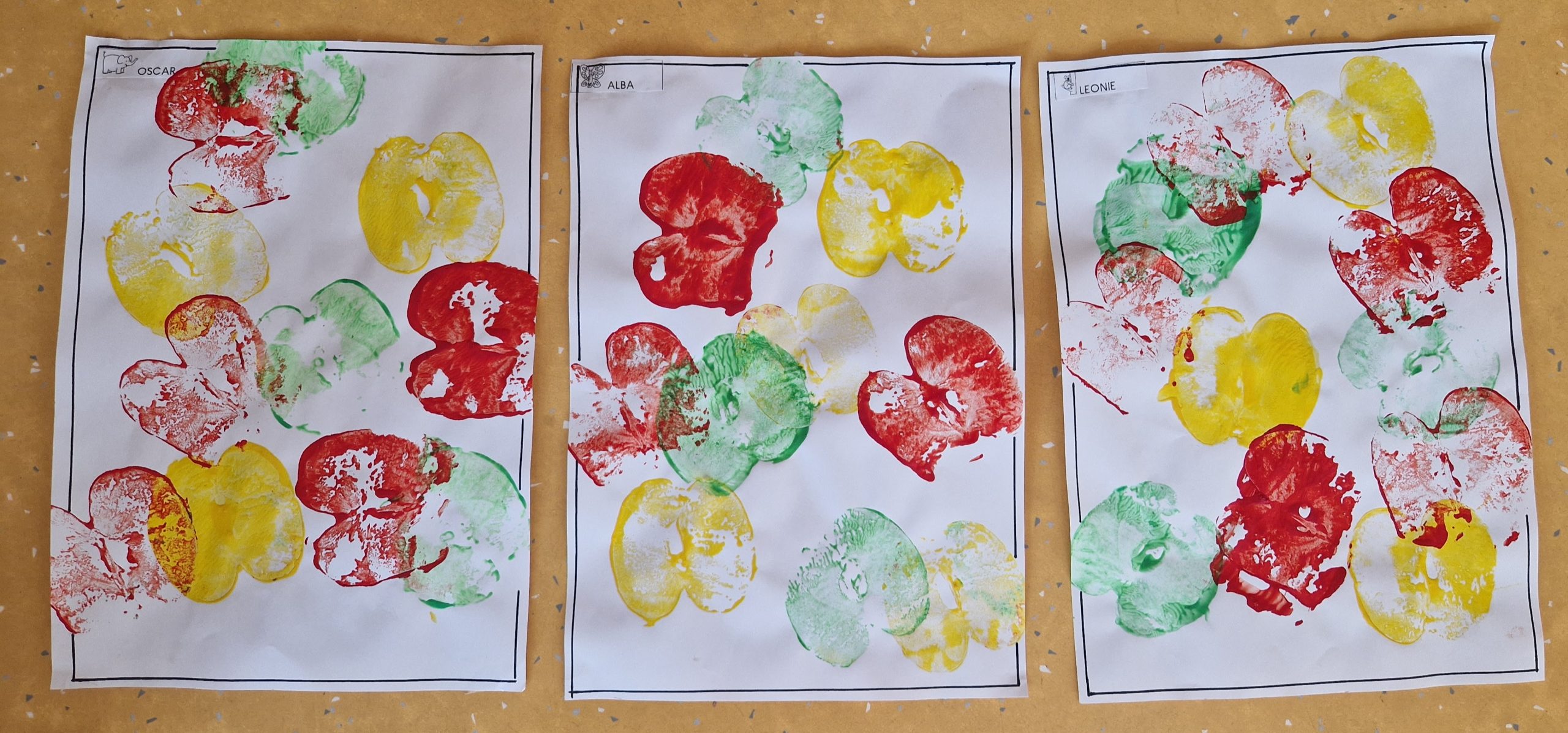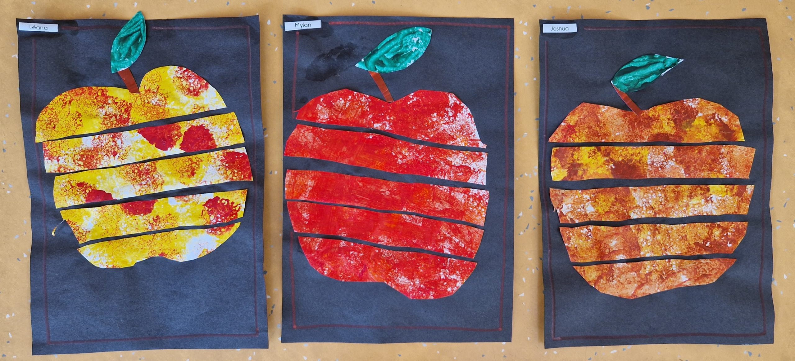 Les pommes ont inspiré les élèves de la classe : empreintes et découpage.