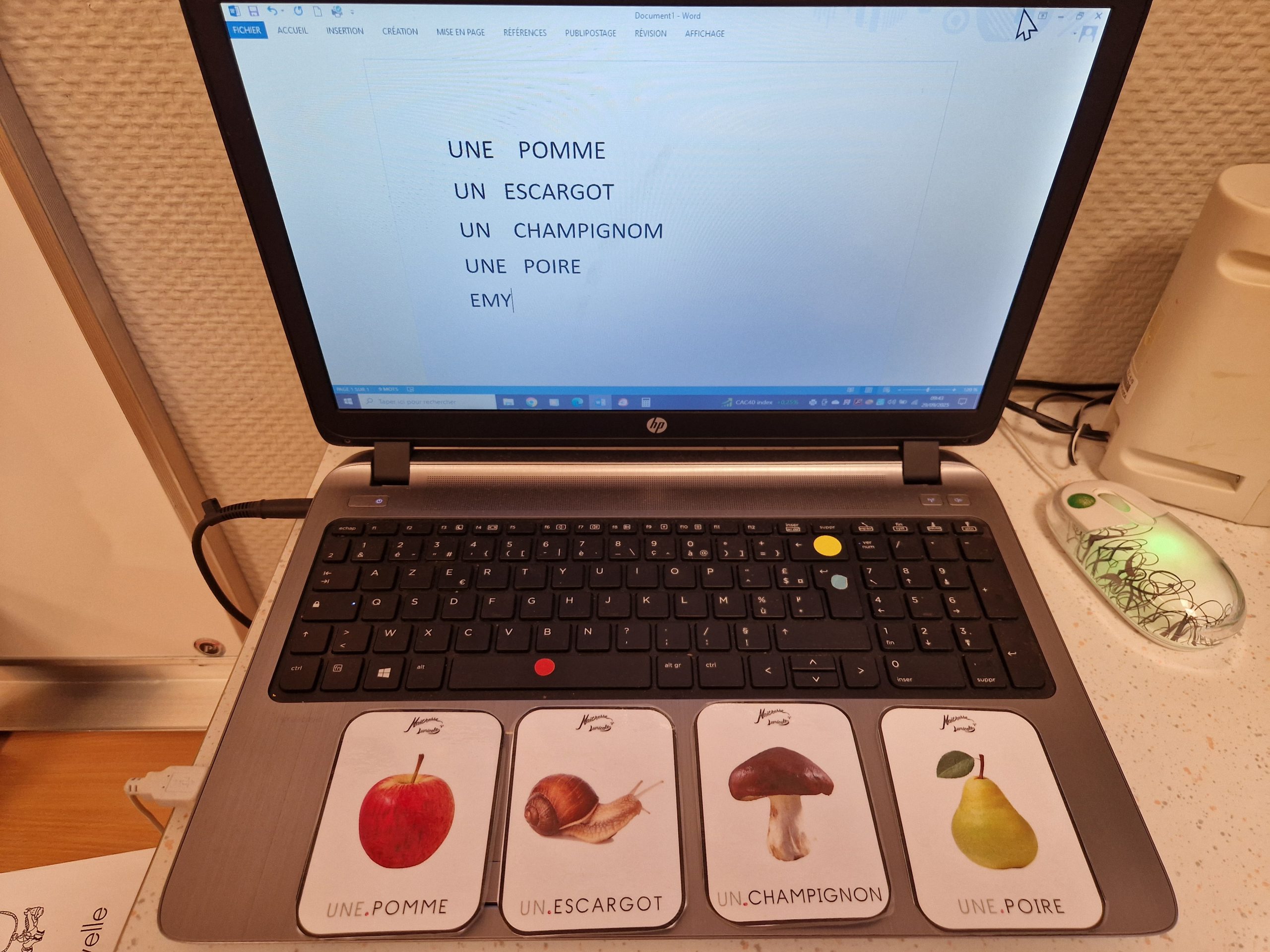 Les élèves de Grande Section poursuivent l’entrainement : copier un mot en capitales d’imprimerie à l’aide d’un clavier.