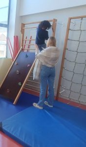 3ème atelier : Grimper sur les barreaux de la structure, avancer sur l’échelle (à 4 pattes ou debout pour les plus courageux) et glisser sur le toboggan.