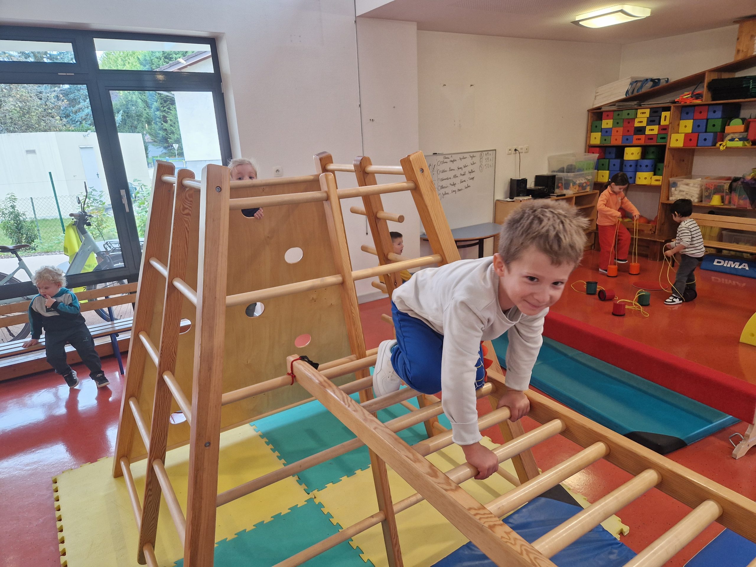 1er atelier : Escalader le mur, toucher le cadre tout en haut et redescendre par l’espalier